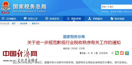 經(jīng)濟(jì)日?qǐng)?bào)-中國(guó)經(jīng)濟(jì)網(wǎng)10月8日訊 記者從國(guó)家稅務(wù)總局網(wǎng)站獲悉,10月2日,國(guó)家稅務(wù)總局下發(fā)《國(guó)家稅務(wù)總局關(guān)于進(jìn)一步規(guī)范影視行業(yè)稅收秩序有關(guān)工作的通知》(以下簡(jiǎn)稱(chēng)“《通知》”),進(jìn)一步部署開(kāi)展規(guī)范影視行業(yè)稅收秩序工作。