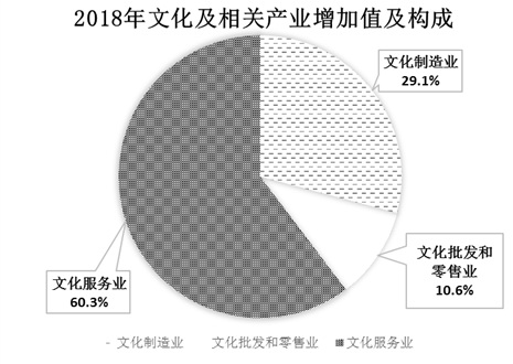 按行業(yè)大類分,2018年文化制造業(yè)增加值為11999億元,占文化及相關(guān)產(chǎn)業(yè)增加值的比重為29.1%;文化批發(fā)和零售業(yè)增加值為4340億元,占比為10.6%;文化服務(wù)業(yè)增加值為24832億元,占比為60.3%。