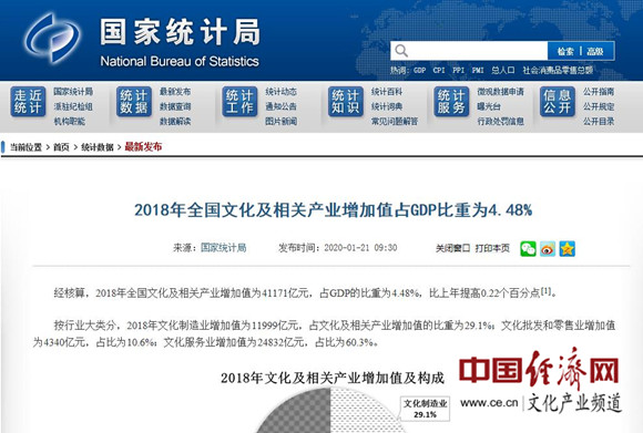 經(jīng)濟(jì)日報-中國經(jīng)濟(jì)網(wǎng)北京1月21日訊 1月21日,國家統(tǒng)計局發(fā)布2018年全國文化及相關(guān)產(chǎn)業(yè)增加值相關(guān)數(shù)據(jù)。據(jù)經(jīng)濟(jì)日報-中國經(jīng)濟(jì)網(wǎng)文化產(chǎn)業(yè)頻道(微信號:cewenhua)了解,經(jīng)核算,2018年全國文化及相關(guān)產(chǎn)業(yè)增加值為41171億元,占GDP的比重為4.48%,比上年提高0.22個百分點(diǎn)。>>>更多政策可查看中國經(jīng)濟(jì)網(wǎng)“中國文化產(chǎn)業(yè)政策庫”