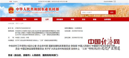 經(jīng)濟(jì)日報(bào)-中國經(jīng)濟(jì)網(wǎng)北京7月14日訊 近日,中央農(nóng)辦、農(nóng)業(yè)農(nóng)村部、發(fā)展改革委、財(cái)政部、人民銀行、銀保監(jiān)會(huì)、證監(jiān)會(huì)等7部門聯(lián)合印發(fā)《關(guān)于擴(kuò)大農(nóng)業(yè)農(nóng)村有效投資 加快補(bǔ)上“三農(nóng)”領(lǐng)域突出短板的意見》(以下簡稱《意見》),部署擴(kuò)大農(nóng)業(yè)農(nóng)村有效投資,為打贏脫貧攻堅(jiān)戰(zhàn)和全面建成小康社會(huì)提供堅(jiān)實(shí)支撐。