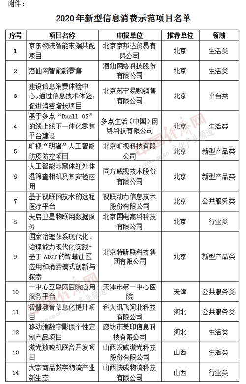 官宣!工信部公示2020新型信息消費(fèi)示范項(xiàng)目(附名單)