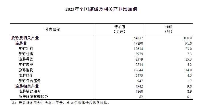 從內(nèi)部構(gòu)成看,旅游業(yè)增加值為49890億元,占旅游及相關(guān)產(chǎn)業(yè)增加值比重為91.0%,比上年提高1.7個百分點(diǎn)。旅游相關(guān)產(chǎn)業(yè)增加值為4942億元,占旅游及相關(guān)產(chǎn)業(yè)增加值比重為9.0%,比上年下降1.7個百分點(diǎn)?!?/p>