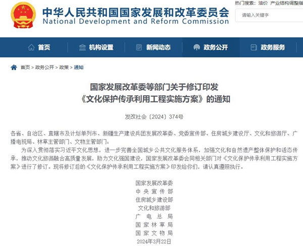 中國經(jīng)濟(jì)網(wǎng)北京4月8日訊(記者 成琪)據(jù)國家發(fā)改委網(wǎng)站4月7日消息,為進(jìn)一步完善全國城鄉(xiāng)公共文化服務(wù)體系,加強(qiáng)文化和自然遺產(chǎn)整體保護(hù)和活態(tài)傳承,推動(dòng)文化旅游融合高質(zhì)量發(fā)展,助力文化強(qiáng)國建設(shè),國家發(fā)展改革委會(huì)同相關(guān)部門對(duì)《文化保護(hù)傳承利用工程實(shí)施方案》(以下簡(jiǎn)稱“《方案》”)進(jìn)行了修訂。《方案》明確,要依托國家級(jí)資源新建或改擴(kuò)建一批重大文化設(shè)施,提升公共文化服務(wù)水平,促進(jìn)優(yōu)秀傳統(tǒng)文化和寶貴自然遺產(chǎn)整體保護(hù)和活態(tài)傳承,推動(dòng)高質(zhì)量發(fā)展和創(chuàng)造高品質(zhì)生活相得益彰。