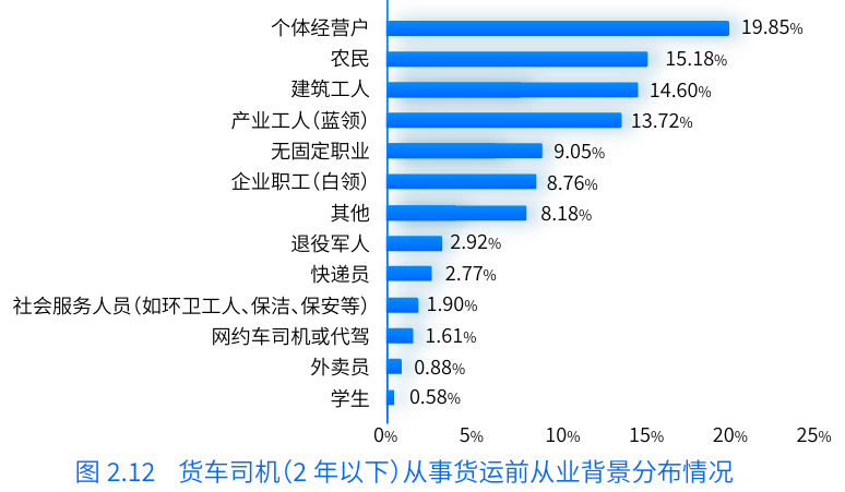 不僅如此,報告中還提到,過往貨運行業(yè)對傳統(tǒng)行業(yè)從業(yè)者的吸引力較強(qiáng),多為農(nóng)民、個體經(jīng)營戶、產(chǎn)業(yè)工人(藍(lán)領(lǐng))、無固定職業(yè)、建筑工人等群體。而近幾年,轉(zhuǎn)型從事貨車司機(jī)的職業(yè)還包含了企業(yè)職工(白領(lǐng))、社會服務(wù)人員、學(xué)生等,另外,外賣員、快遞員、網(wǎng)約車司機(jī)及代駕司機(jī)等新型靈活就業(yè)者也有部分人群選擇轉(zhuǎn)行成為貨車司機(jī)。