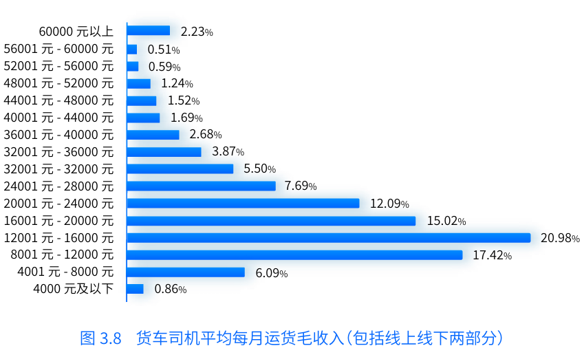 報告中提到,貨車司機(jī)每月毛收入平均值為20441元。在剔除油(電、氣)費、高速費、保險、保養(yǎng)和平臺信息技術(shù)服務(wù)費等成本后,貨車司機(jī)平均月凈收入均值為12063元。