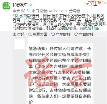 據(jù)長春市委網(wǎng)絡(luò)安全和信息化委員會(huì)辦公室官方微博5月12日消息,經(jīng)與相關(guān)部門核實(shí),近日網(wǎng)傳“福臨家園小區(qū)現(xiàn)已整個(gè)小區(qū)封閉隔離,長江路步行街現(xiàn)已封閉”等內(nèi)容均系謠言,請以官方發(fā)布為準(zhǔn),再次提醒大家特殊時(shí)期切勿信謠傳謠,引起不必要的恐慌。