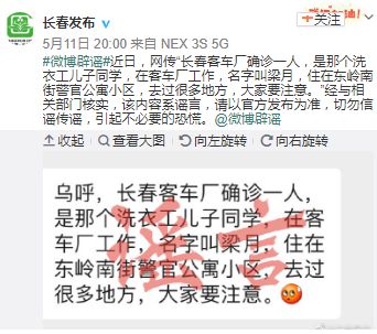 此外,5月11日晚,長春市委網(wǎng)絡(luò)安全和信息化委員會(huì)辦公室官方微博發(fā)消息稱,經(jīng)與相關(guān)部門核實(shí),“長春客車廠確診一人”等信息也系謠言。