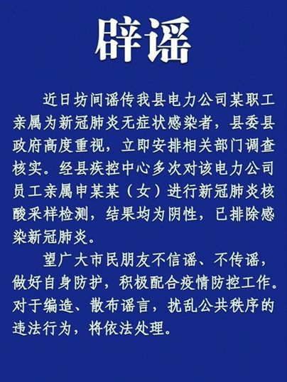 據(jù)四川省達(dá)州市大竹縣委宣傳部官微消息,近日坊間謠傳大竹縣電力公司某職工親屬為新冠肺炎無癥狀感染者,大竹縣委縣政府高度重視,立即安排相關(guān)部門調(diào)查核實(shí)。經(jīng)縣疾控中心多次對該電力公司員工親屬申某某(女)進(jìn)行新冠肺炎核酸采樣檢測,結(jié)果均為陰性,已排除感染新冠病毒。望廣大市民朋友不信謠、不傳謠,做好自身防護(hù),積極配合疫情防控工作。對于編造、散布謠言,擾亂公共秩序的違法行為,將依法處理。