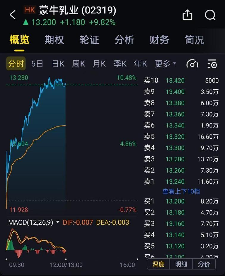 早盤,蒙牛以11.92元小幅低開后一路高漲,截至中午收盤,蒙牛乳業(yè)報13.20元,上漲9.82%,成交4.64億元,成交量相較前一交易日顯著放大。