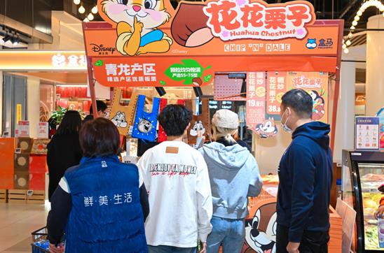 在哈一口氣便能凝結出霧的寒冬,暖呼呼的糖炒栗子最能溫暖人心。在午后的盒馬線下門店,糖炒栗子的檔口已經(jīng)排起了長隊,工作人員將剛炒制出來的新鮮栗子裝進了印有迪士尼人物奇奇蒂蒂形象的紙盒里,遞給消費者。“甜甜糯糯的栗子,最適合當冬天小零食”、“沖著這個包裝來買的,太可愛了?!?/p>