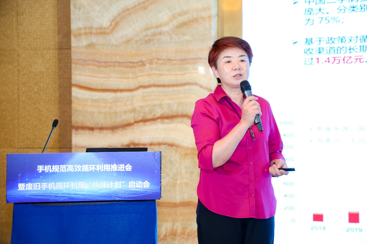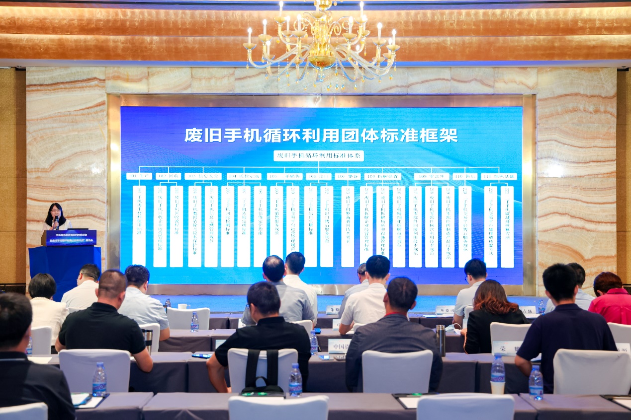 中國(guó)循環(huán)經(jīng)濟(jì)協(xié)會(huì)互聯(lián)網(wǎng)+資源循環(huán)利用專委會(huì)秘書長(zhǎng)侯允在會(huì)上發(fā)布廢舊手機(jī)循環(huán)利用團(tuán)體標(biāo)準(zhǔn)框架。(主辦方供圖)