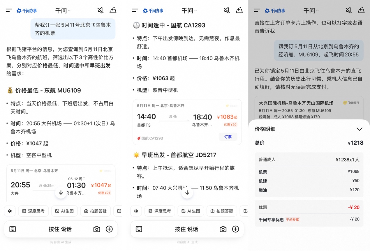 例如,用戶對(duì)千問APP說“幫我訂一張5月11日北京飛烏魯木齊的機(jī)票”,它即刻理解用戶意圖并推薦了JD5217、CA1293、MU6109三個(gè)不同時(shí)刻起飛的航班,3張機(jī)票均顯示有20元左右的“千問專享優(yōu)惠”,點(diǎn)擊具體航班卡片即可進(jìn)入確認(rèn)和支付環(huán)節(jié)。
