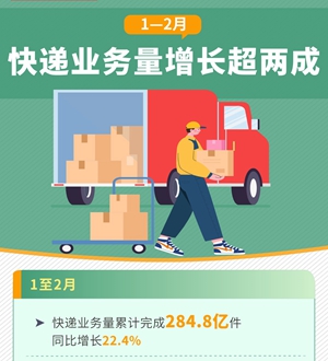 1至2月,快遞業(yè)務(wù)量保持快速攀升,累計(jì)完成284.8億件,同比增長(zhǎng)22.4%。