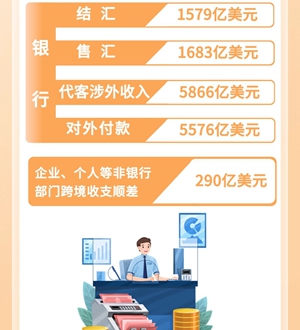 2月,銀行結(jié)匯1579億美元,售匯1683億美元;銀行代客涉外收入5866億美元,對(duì)外付款5576億美元。