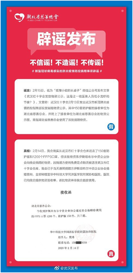 為此,湖北省慈善總會(huì)回應(yīng): “2月14日,我會(huì)確實(shí)從武漢市紅十字會(huì)倉(cāng)庫(kù)運(yùn)走了150套防護(hù)服和1200個(gè)FFP3口罩,但該批物資系伊斯坦布爾中資企業(yè)協(xié)會(huì)向我會(huì)捐贈(zèng)的物資,因捐贈(zèng)方使用免費(fèi)定點(diǎn)物流被送往武漢市紅十字會(huì)倉(cāng)庫(kù);我會(huì)已于當(dāng)天遵照捐贈(zèng)方伊斯坦布爾中資企業(yè)協(xié)會(huì)捐贈(zèng)意向,全部轉(zhuǎn)贈(zèng)至華中科技大學(xué)同濟(jì)醫(yī)學(xué)院附屬協(xié)和醫(yī)院,醫(yī)院已向我會(huì)提供物資簽收單,該批物資并非我會(huì)直接使用。”