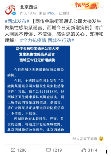 截至2月21日18時(shí),經(jīng)西城區(qū)衛(wèi)生健康委認(rèn)真調(diào)查核實(shí),網(wǎng)上“金融街某通訊公司大樓發(fā)生聚集性感染”是虛假信息,系謠言。請廣大網(wǎng)民從正規(guī)渠道獲取防疫信息。