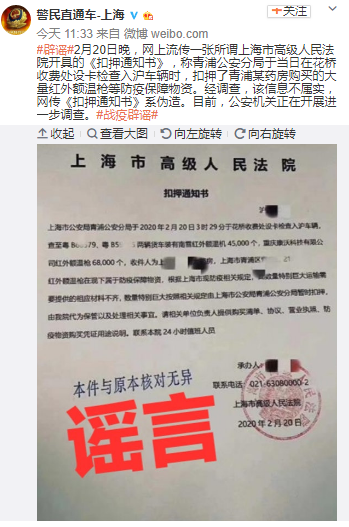 經(jīng)濟日報-中國經(jīng)濟網(wǎng)2月22日訊 (記者 朱國旺 郭文培) 2月20日晚,網(wǎng)上流傳一張所謂上海市高級人民法院開具的《扣押通知書》,稱青浦公安分局于當(dāng)日(20日)在花橋收費處設(shè)卡檢查入滬車輛時,扣押了青浦某藥房購買的大量紅外額溫槍等防疫保障物資。