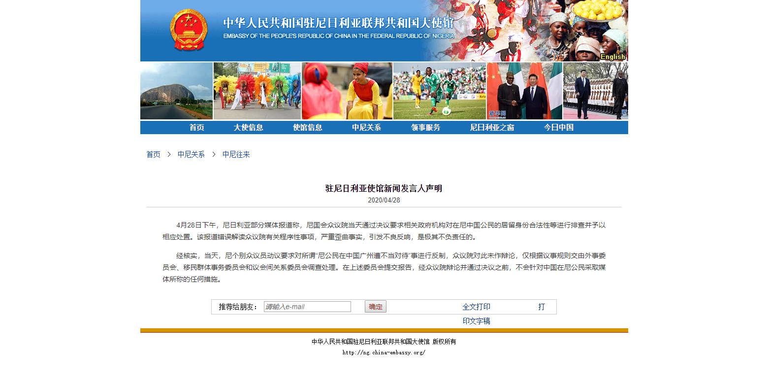 駐尼日利亞使館表示,經(jīng)核實(shí),當(dāng)天,尼個(gè)別眾議員動(dòng)議要求對(duì)所謂“尼公民在中國廣州遭不當(dāng)對(duì)待”事進(jìn)行反制,眾議院對(duì)此未作辯論,僅根據(jù)議事規(guī)則交由外事委員會(huì)、移民群體事務(wù)委員會(huì)和議會(huì)間關(guān)系委員會(huì)調(diào)查處理。在上述委員會(huì)提交報(bào)告,經(jīng)眾議院辯論并通過決議之前,不會(huì)針對(duì)中國在尼公民采取媒體所稱的任何措施。