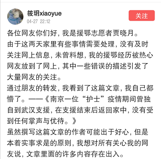 4月27-28日,當(dāng)事人賈曉月連發(fā)2文澄清事實(shí),“本著實(shí)事求是的原則,我想對(duì)所有關(guān)心我的網(wǎng)友說,文章里面的許多內(nèi)容存在出入。” 賈曉月直言,網(wǎng)傳文章“太夸張了”。