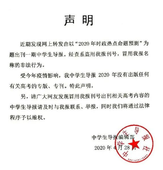 針對(duì)網(wǎng)傳“中學(xué)生導(dǎo)報(bào)刊登詩作《新冠病毒終于哭了》”一事,該報(bào)主管單位蘭州日?qǐng)?bào)社于4月28日發(fā)布聲明稱,近期發(fā)現(xiàn)網(wǎng)上轉(zhuǎn)發(fā)有以“2020年時(shí)政熱點(diǎn)命題預(yù)測”為題出刊一期中學(xué)生導(dǎo)報(bào)。經(jīng)查系盜用中學(xué)生導(dǎo)報(bào)刊號(hào),冒用中學(xué)生導(dǎo)報(bào)名稱的非法行為。此外,受疫情影響,中學(xué)生導(dǎo)報(bào)2020年沒有出版任何有關(guān)高考的專版、???。