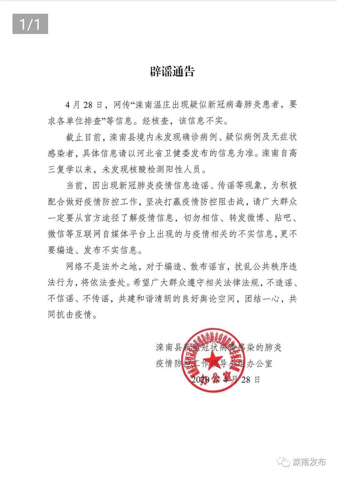 《辟謠通告》稱,截止目前,灤南縣境內(nèi)未發(fā)現(xiàn)確診病例、疑似病例及無癥狀感染者,具體信息請(qǐng)以河北省衛(wèi)健委發(fā)布的信息為準(zhǔn)。灤南自高三復(fù)學(xué)以來,未發(fā)現(xiàn)核酸檢測陽性人員。