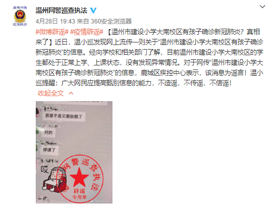 據(jù)@溫州網(wǎng)警巡查執(zhí)4月28日消息,近日,針對(duì)網(wǎng)傳“溫州市建設(shè)小學(xué)大南校區(qū)有孩子確診新冠肺炎”的信息。經(jīng)向?qū)W校和相關(guān)部門了解,目前溫州市建設(shè)小學(xué)大南校區(qū)的學(xué)生都處于正常上學(xué)、上課狀態(tài),沒有發(fā)現(xiàn)異常情況。鹿城區(qū)疾控中心也表示,“溫州市建設(shè)小學(xué)大南校區(qū)有孩子確診新冠肺炎”為謠言。