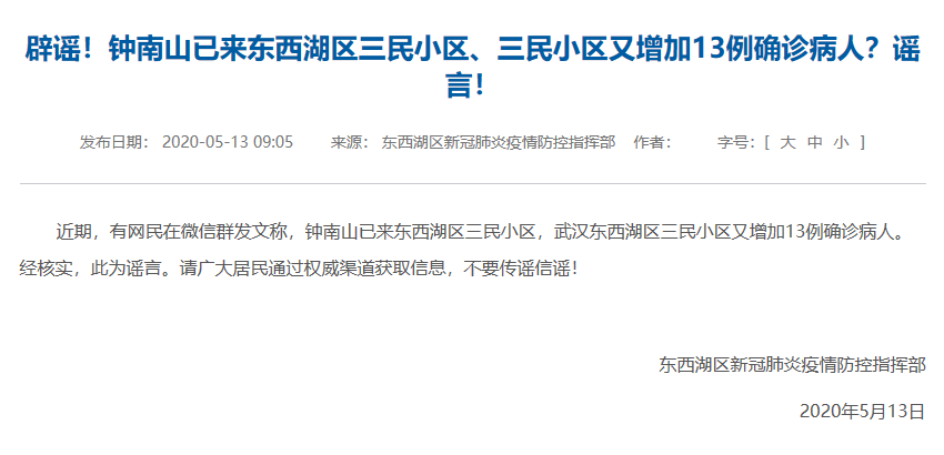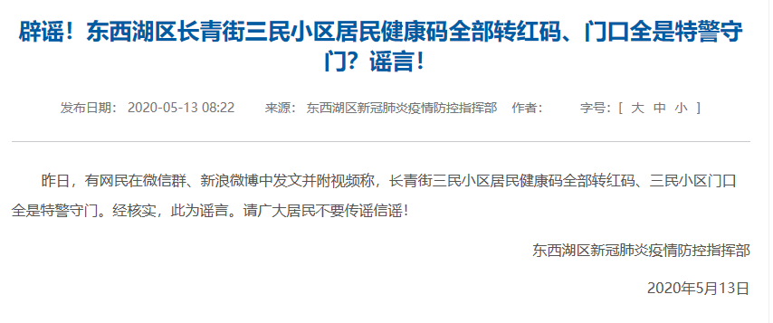 據(jù)武漢市東西湖區(qū)人民政府官網(wǎng)5月13日消息,經(jīng)核實(shí),網(wǎng)傳“鐘南山已來東西湖區(qū)三民小區(qū),武漢東西湖區(qū)三民小區(qū)又增加13例確診病人?!?“長青街三民小區(qū)居民健康碼全部轉(zhuǎn)紅碼、三民小區(qū)門口全是特警守門”均系謠言。