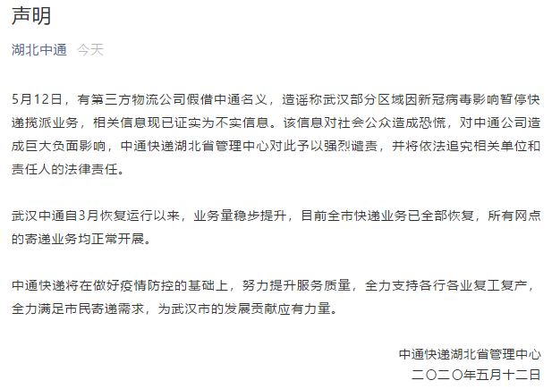 5月12日,湖北中通吉物流有限公司官微“湖北中通”發(fā)布聲明稱,5月12日,有第三方物流公司假借中通名義,造謠稱武漢部分區(qū)域因新冠病毒影響暫??爝f攬派業(yè)務(wù),相關(guān)信息現(xiàn)已證實(shí)為不實(shí)信息。武漢中通自3月恢復(fù)運(yùn)行以來,業(yè)務(wù)量穩(wěn)步提升,目前全市快遞業(yè)務(wù)已全部恢復(fù),所有網(wǎng)點(diǎn)的寄遞業(yè)務(wù)均正常開展。