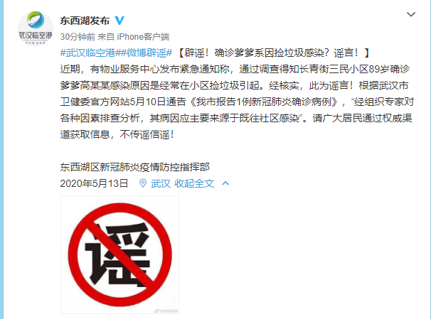 據(jù)武漢市東西湖區(qū)人民政府官方微博5月13日消息,近期,有物業(yè)服務(wù)中心發(fā)布緊急通知稱,通過調(diào)查得知武漢市東西湖區(qū)長青街三民小區(qū)89歲確診爹爹高某某感染原因是經(jīng)常在小區(qū)撿垃圾引起。經(jīng)核實(shí),此為謠言。根據(jù)武漢市衛(wèi)健委官方網(wǎng)站5月10日通告《我市報(bào)告1例新冠肺炎確診病例》,“經(jīng)組織專家對(duì)各種因素排查分析,其病因應(yīng)主要來源于既往社區(qū)感染”。請(qǐng)廣大居民通過權(quán)威渠道獲取信息,不傳謠信謠!