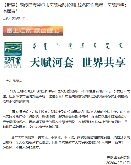 謠言粉碎機(jī)五:內(nèi)蒙古巴彥淖爾市醫(yī)院核酸檢測出2名陽性患者?謠言!