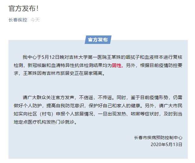 近日,有網(wǎng)傳稱吉林大學(xué)第一醫(yī)院出現(xiàn)新冠病例。5月13日,長春市疾病預(yù)防控制中心官微對(duì)此回應(yīng)稱,長春市疾病預(yù)防控制中心于5月12日晚對(duì)吉林大學(xué)第一醫(yī)院王某姝的咽拭子和血液樣本進(jìn)行復(fù)核檢測,新冠核酸和血清特異性抗體檢測結(jié)果均為陰性。另外,根據(jù)目前疫情防控要求,王某姝因有吉林市旅居史正在居家隔離。請(qǐng)廣大群眾關(guān)注官方發(fā)聲,不信謠,不傳謠。