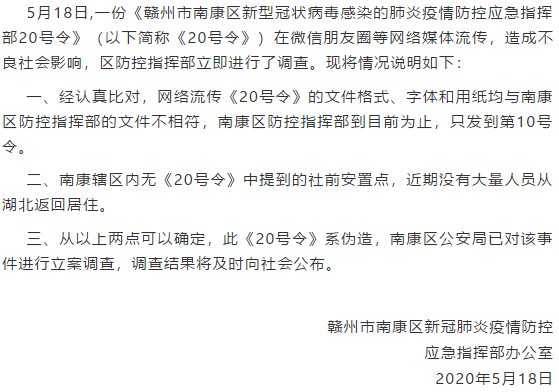 據(jù)中共贛州市南康區(qū)委宣傳部官微“南康發(fā)布”5月19日消息,贛州市南康區(qū)新冠肺炎疫情防控應急指揮部辦公室稱,5月18日,一份《贛州市南康區(qū)新型冠狀病毒感染的肺炎疫情防控應急指揮部20號令》(以下簡稱《20號令》)在微信朋友圈等網(wǎng)絡媒體流傳,造成不良社會影響,南康區(qū)防控指揮部立即進行了調(diào)查?,F(xiàn)將情況說明如下: