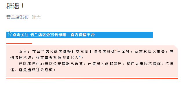 據(jù)中共大連市普蘭店區(qū)委宣傳部“普蘭店發(fā)布”5月21日消息,經(jīng)普蘭店區(qū)疾控中心與公安局聯(lián)合調(diào)查,網(wǎng)傳 “王金祥,從吉林疫區(qū)來普(大連市普蘭店區(qū)),其他信息不詳,現(xiàn)在需要緊急排查此人……”為虛假消息,望廣大市民不信謠、不傳謠。