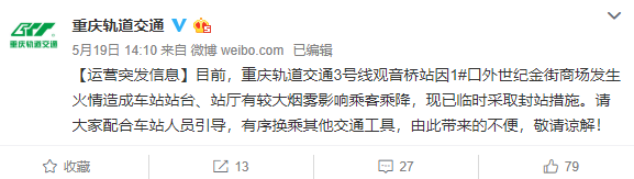 近日,有消息稱因出現(xiàn)疑似病例,重慶軌道交通3號線觀音橋站被封。對此,5月19日14時,重慶市軌道交通(集團)有限公司@重慶軌道交通回應稱,目前,重慶軌道交通3號線觀音橋站因1#口外世紀金街商場發(fā)生火情造成車站站臺、站廳有較大煙霧影響乘客乘降,現(xiàn)已臨時采取封站措施。????