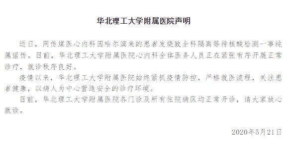 5月21日,華北理工大學附屬醫(yī)院發(fā)布聲明稱,近日,網(wǎng)傳“煤醫(yī)(現(xiàn)為華北理工大學附屬醫(yī)院)心內(nèi)科因哈爾濱來的患者發(fā)燒致全科隔離等待核酸檢測”一事純屬謠傳。目前,華北理工大學附屬醫(yī)院心內(nèi)科全體醫(yī)務人員正在緊張有序開展正常診療,就診秩序良好。
