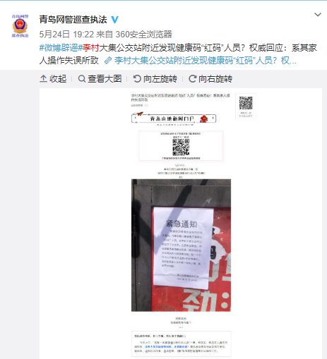 據(jù)半島都市報(bào)官微5月24日報(bào)道,針對“發(fā)現(xiàn)一名健康通行碼紅碼人員”一事,經(jīng)落實(shí),系其家人操作失誤所致,該名人員實(shí)際持有綠碼,無健康問題。此外,5月24日,山東省青島市公安局網(wǎng)絡(luò)警察支隊(duì)官方微博也對此傳言進(jìn)行了辟謠。