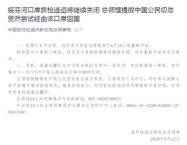 對此,6月12日,中國駐符拉迪沃斯托克總領(lǐng)事館辟謠稱,經(jīng)向國內(nèi)主管部門核實(shí),綏芬河口岸旅檢通道將繼續(xù)關(guān)閉,何時(shí)重新開放將另行通告。目前,濱海邊疆區(qū)與中方間波格拉尼奇內(nèi)—綏芬河、克拉斯基諾—琿春、波爾塔夫卡—東寧3對中俄公路客運(yùn)口岸均繼續(xù)關(guān)閉。