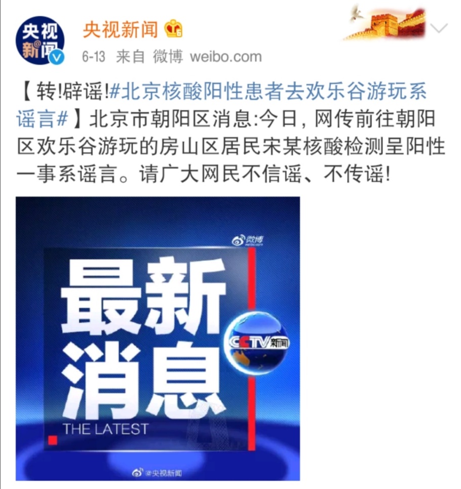 另據(jù)@央視新聞,針對“家住房山區(qū)的宋某在歡樂谷游玩時(shí)發(fā)現(xiàn)自己核酸檢測結(jié)果呈陽性”一事,北京市朝陽區(qū)對此表示,該信息是謠言。