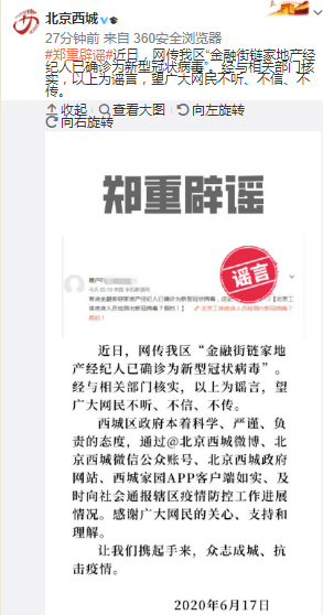 經(jīng)濟日報-中國經(jīng)濟網(wǎng)6月17日訊(記者朱國旺 郭文培)據(jù)北京市西城區(qū)人民政府新聞辦公室官方微博17日消息,經(jīng)與相關(guān)部門核實,網(wǎng)傳西城區(qū)“金融街鏈家地產(chǎn)經(jīng)紀(jì)人已確診為新型冠狀病毒”為謠言,望廣大網(wǎng)民不聽、不信、不傳。