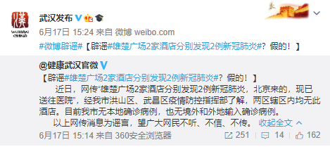 據(jù)武漢市互聯(lián)網(wǎng)信息辦公室17日消息,經(jīng)武漢市洪山區(qū)、武昌區(qū)疫情防控指揮部了解,網(wǎng)傳“雄楚廣場(chǎng)2家酒店分別發(fā)現(xiàn)2例新冠肺炎”系謠言。