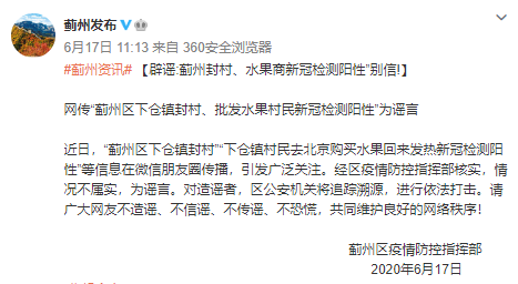 據(jù)天津市薊州區(qū)人民政府官方微博,經(jīng)薊州區(qū)疫情防控指揮部核實(shí),網(wǎng)傳“薊州區(qū)下倉(cāng)鎮(zhèn)村民去北京買(mǎi)水果回來(lái)發(fā)熱,新冠檢測(cè)陽(yáng)性”等信息為謠言。對(duì)造謠者,薊州區(qū)公安機(jī)關(guān)將追蹤溯源,進(jìn)行依法打擊。