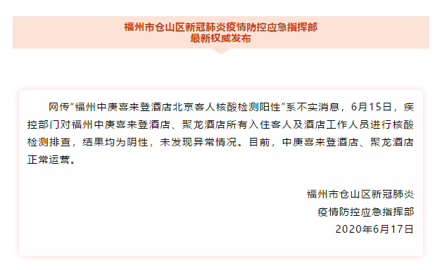 據(jù)《福建日?qǐng)?bào)》官微,福州市倉(cāng)山區(qū)新冠肺炎疫情防控應(yīng)急指揮部稱,網(wǎng)傳“福州中庚喜來(lái)登酒店北京客人核酸檢測(cè)陽(yáng)性”為不實(shí)消息。