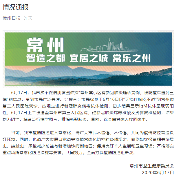 通報(bào)稱,6月17日,常州市多個(gè)微信朋友圈傳播“常州某小區(qū)有新冠肺炎確診病例,被防疫車送到三院”的信息,受到市民廣泛關(guān)注。經(jīng)核查:市民徐某于6月16日因“牙痛伴胸悶不適”到常州市第二人民醫(yī)院就診,按規(guī)定進(jìn)行新冠肺炎病毒抗體檢測(cè),初步結(jié)果顯示IgM抗體呈現(xiàn)弱陽(yáng)性;6月17日上午被送至常州市第三人民醫(yī)院,經(jīng)新冠肺炎病毒核酸及抗體復(fù)核檢測(cè),結(jié)果均為陰性,結(jié)合流行病學(xué)調(diào)查,排除新冠肺炎。目前,徐某由其家人接回家中。