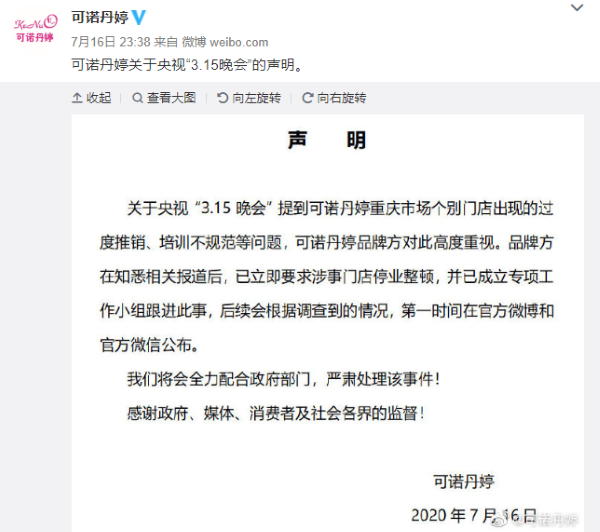 昨日晚間,可諾丹婷針對(duì) 315 晚會(huì)報(bào)道作出回應(yīng)??芍Z丹婷表示,關(guān)于央視“3.15晚會(huì)”提到可諾丹婷重慶市場(chǎng)個(gè)別門店出現(xiàn)的過(guò)度推銷、培訓(xùn)不規(guī)范等問(wèn)題,可諾丹婷品牌方對(duì)此高度重視。品牌方在知悉相關(guān)報(bào)道后,已立即要求涉事門店停業(yè)整頓,并已成立專項(xiàng)工作小組跟進(jìn)此事,后續(xù)會(huì)根據(jù)調(diào)查到的情況,第一時(shí)間在官方微博和官方微信公布。