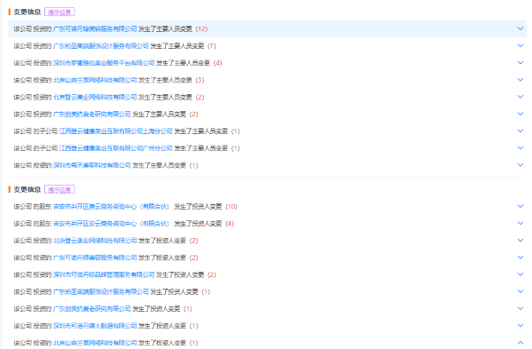 值得注意的是,天眼查顯示,近年來(lái),江西登云健康美業(yè)互聯(lián)有限公司多名股東企業(yè)及多家投資企業(yè)主要人員變動(dòng)頻繁。如,2016年以來(lái),該公司投資的廣東可諾丹婷美容服務(wù)有限公司發(fā)生主要人員變更累計(jì)12次;該公司的股東吉安市井開區(qū)美云商務(wù)咨詢中心(有限合伙)發(fā)生投資人變更累計(jì)10次。