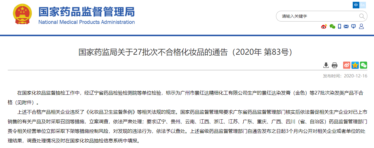 在國家化妝品監(jiān)督抽檢工作中,經(jīng)遼寧省藥品檢驗(yàn)檢測院等單位檢驗(yàn),標(biāo)示為廣州市景紅達(dá)精細(xì)化工有限公司生產(chǎn)的景紅達(dá)染發(fā)膏(金色)等27批次染發(fā)類產(chǎn)品不合格。