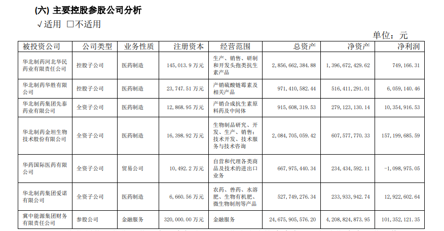 具體來看,參股子公司華北制藥河北華民藥業(yè)有限責(zé)任公司主營頭孢類抗生素產(chǎn)品。報告期內(nèi),其實(shí)現(xiàn)營業(yè)收入54673萬元,同比降低23795萬元,降低30.32%;實(shí)現(xiàn)主營業(yè)務(wù)利潤12237萬元,毛利率同比降低14.23%。