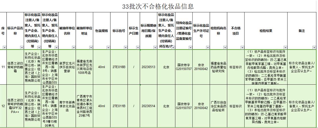 中國(guó)經(jīng)濟(jì)網(wǎng)北京11月16日訊(記者楊奇奇)11月15日,國(guó)家藥監(jiān)局發(fā)布《關(guān)于33批次不合格化妝品的通告》顯示,2批次紐西之謎防曬霜不合格。