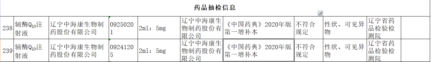 根據(jù)公告,該2批次不合格輔酶Q10注射液,標(biāo)示生產(chǎn)企業(yè)為遼寧中??瞪镏扑幑煞萦邢薰?,生產(chǎn)批號為0925020109241205,規(guī)格為2ml5mg,不符合項目為性狀、可見異物。