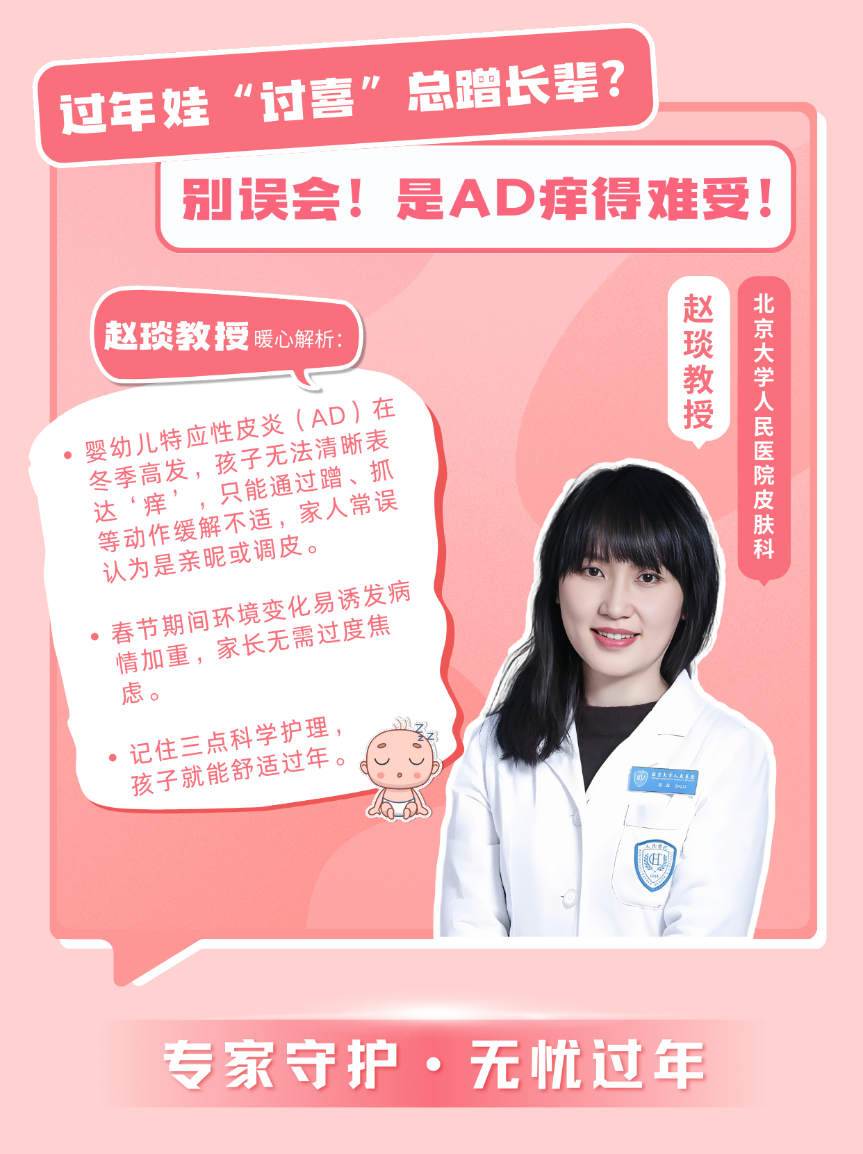 “嬰幼兒特應(yīng)性皮炎(AD)在冬季高發(fā),孩子無法清晰表達(dá)‘癢’,只能通過蹭、抓等動(dòng)作緩解不適,家人常誤認(rèn)為是親昵或調(diào)皮。春節(jié)期間環(huán)境變化易誘發(fā)病情加重,家長無需過度焦慮,記住三點(diǎn)科學(xué)護(hù)理,孩子就能舒適過年: